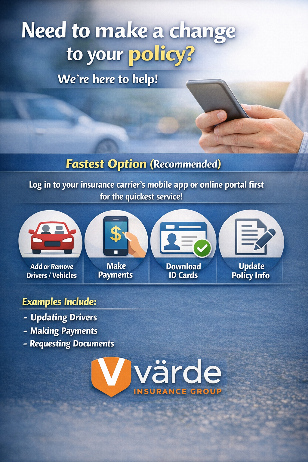 All requests are subject to review, approval, and processing by Varde Insurance Group and, when applicable, the insurance carrier. No changes to coverage, limits, deductibles, or policy status are effective until you receive written confirmation from our office or your insurance company.